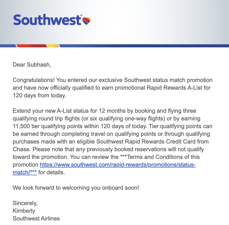 Just to make sure it wasn't just a fluke with JetBlue's Status Match program, we tried the same with Southwest's Status Match program.